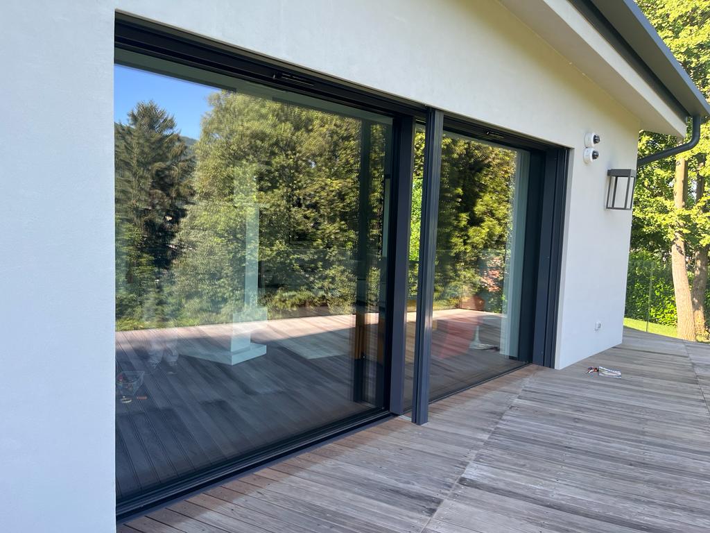 Scorrevole Schuco motorizzato con sistema oscurante integrato. Parapetti in vetro