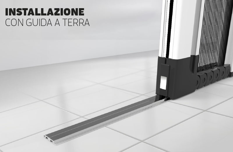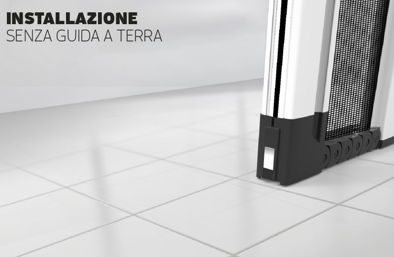 Zanzariere esclusivamente a scorrimento laterale, solitamente vengono usate su vani di grandi dimensioni o in generale nelle portefinestre. La loro particolarità è quella di avere un piccolo cingolo inferiore che permette di mantenere parzialmente aperto il telo, dove invece nelle zanzariere con cassonetto questa cosa non è possibile (o sono completamente aperte o completamente chiuse). Ultimo dettaglio, hanno la possibilità di non avere una guida inferiore, lasciano quindi libero il passaggio.